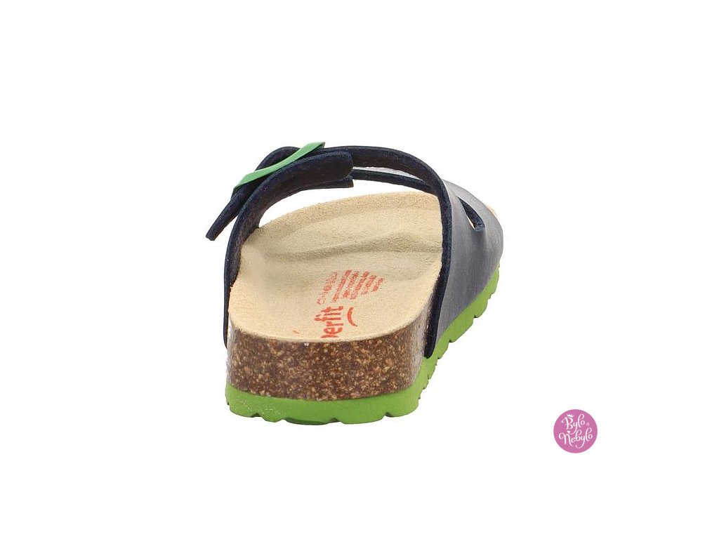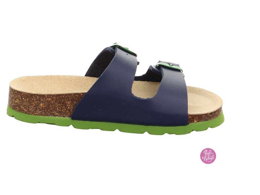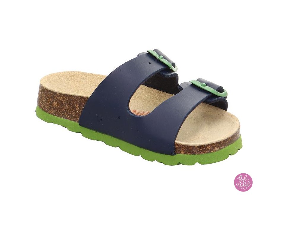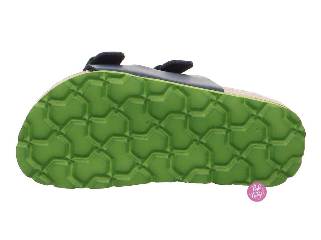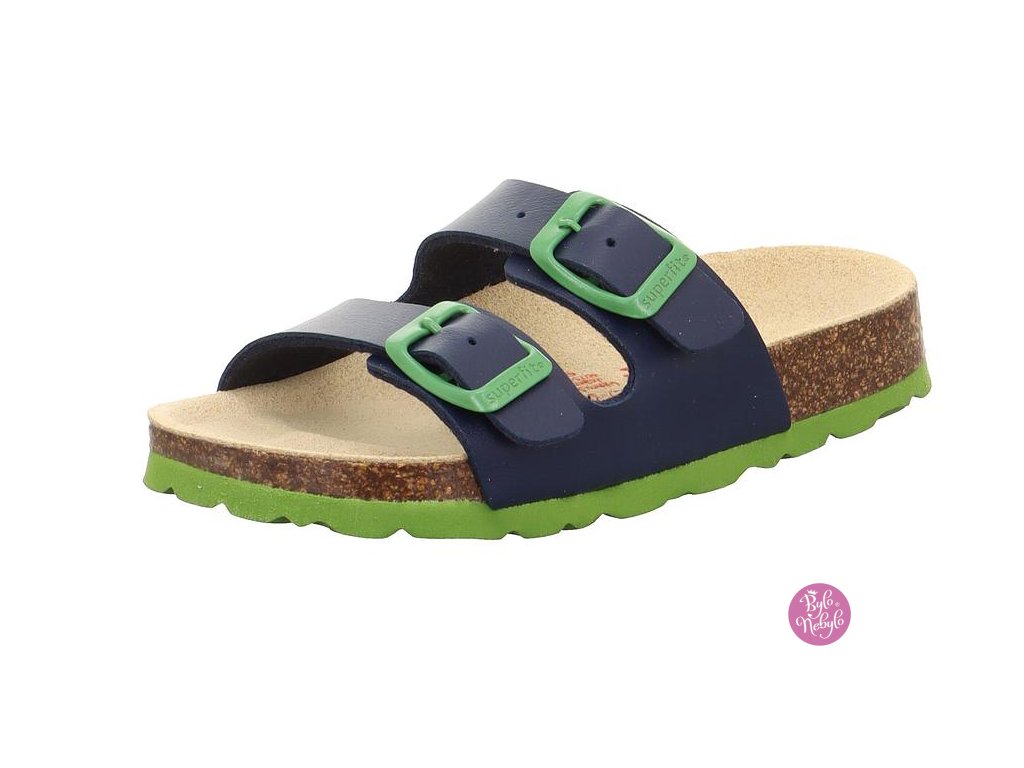 Korkové zdravotní sandále Superfit a tvarovanou stélkou v tmavě modré barvě s zelenými detaily a výraznou zelenou podrážkou.