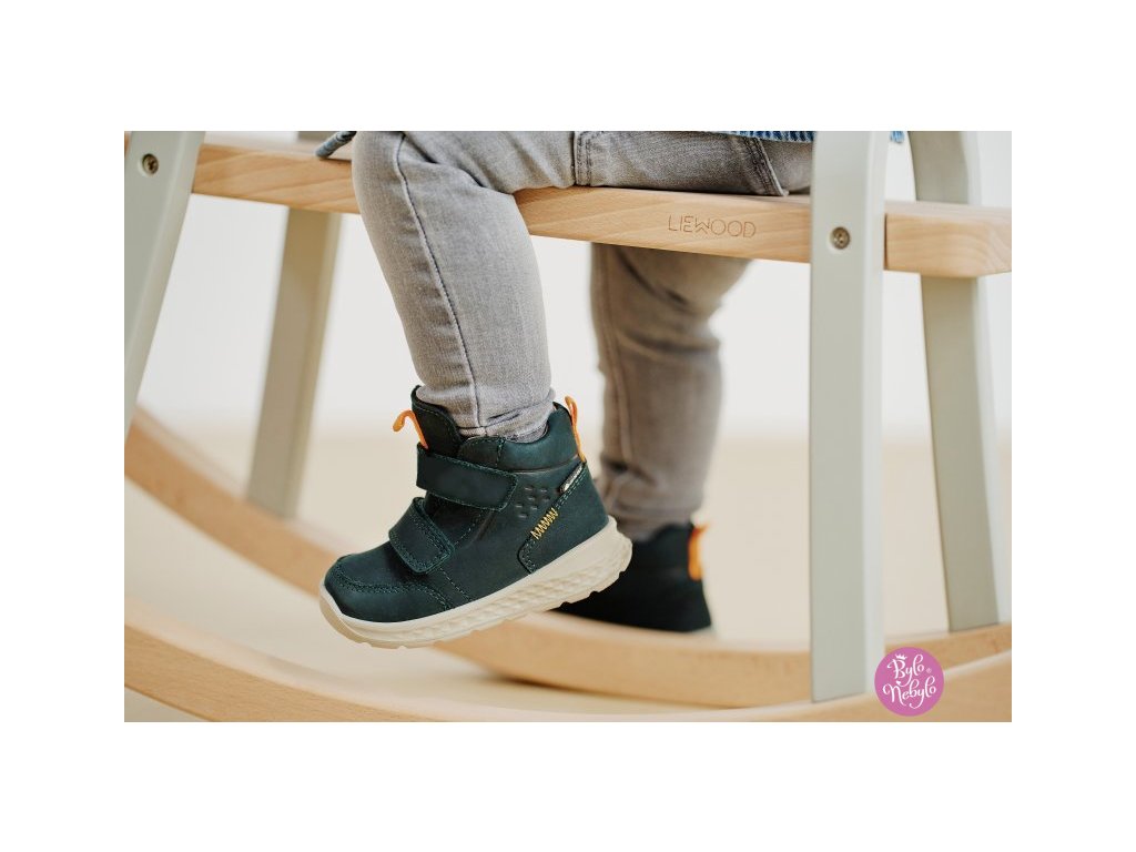 Oblíbená kotníčková celoroční dětská obuv s membránou GORE TEX. Zelená barva, hodně tmavá, pohledově antracit. Sednou na: užší až normální nožky.