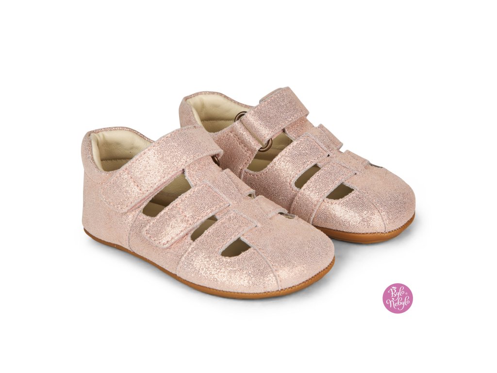 Sandál má tenkou, flexibilní gumovou podrážku, která umožňuje dítěti volný pohyb, zatímco pevná pata zajišťuje stabilní držení na noze. Tato konstrukce pomáhá optimálně podpírat malé nožky, což je ideální při nácviku samostatného stání a pohybu.